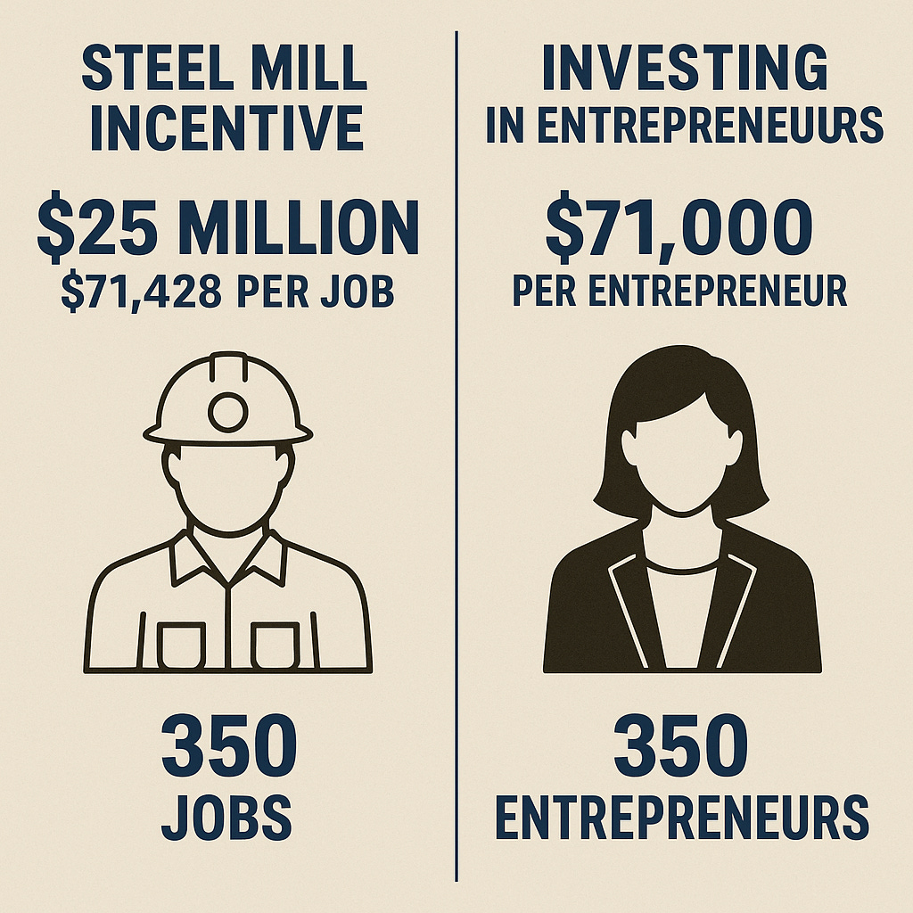 Now imagine if that $25 million wasn’t a one-time corporate handout but an annual investment in Arkansans themselves—startup capital for 350 local entrepreneurs every year, with $71,000 each.